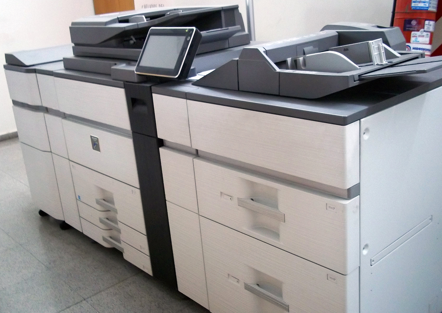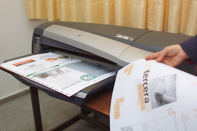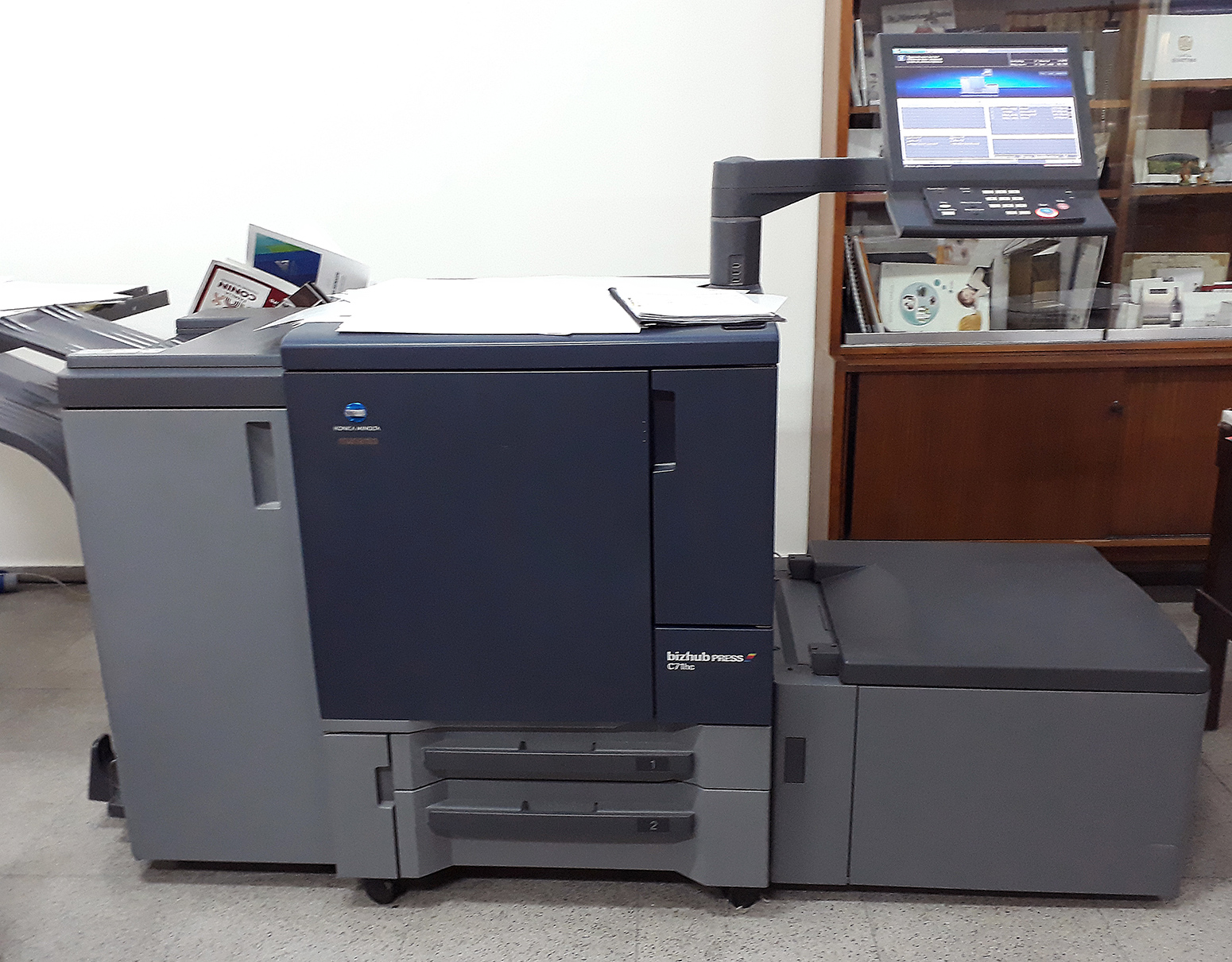 Contamos con impresora de calidad fotográfica, apta para regular curvas de color, ajustar márgenes, imprimir en banner, en papeles texturados por su toner de estado líquido-sólido, imprimir, abrochar y plegar a caballo folletos y revistas en cantidades pequeñas. Más una laser en negro de alta producción que facilita la impresión de libros en bajo número de ejemplares, cuidando la economía del cliente. También incluimos el equipamiento de ploter para cartelería, ploter óptico para corte de contornos de etiquetas y stamping digital sin uso de cuños especiales.
